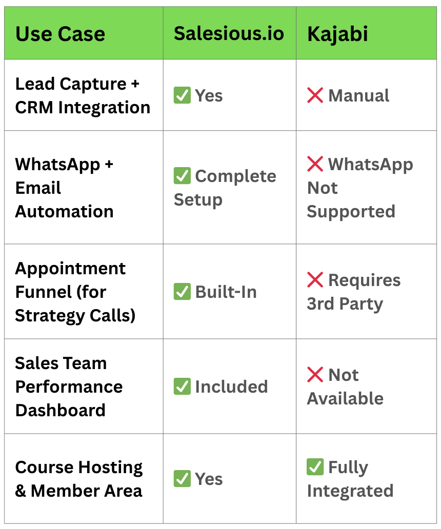 Kajabi is built as an all-in-one course hosting and membership platform. It’s excellent if you want to deliver digital content, but it’s not designed for high-conversion sales workflows.